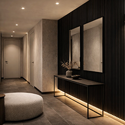 Finisajul cu panourile acustice de nuanta neagra se integreaza armonios in amenajari moderne, minimaliste sau contemporane, aducand caldura vizuala si profunzime peretilor interiori.