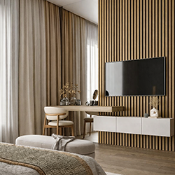 Finisajul tip teak se integreaza armonios in amenajari moderne, minimaliste sau contemporane, aducand caldura vizuala si profunzime peretilor interiori.