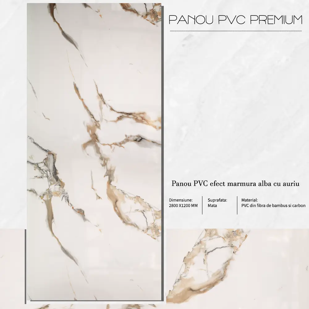 Panoul PVC Premium Marmura Calacatta Gold PETG14 este un panou decorativ modern, cu efect de marmura alba cu auriu, conceput pentru spatii elegante si contemporane. Fabricat dintr-un material compozit avansat, acest panou imbina PVC-ul de inalta calitate cu fibra de bambus si carbune, rezultand un produs extrem de rezistent, stabil si usor de montat.