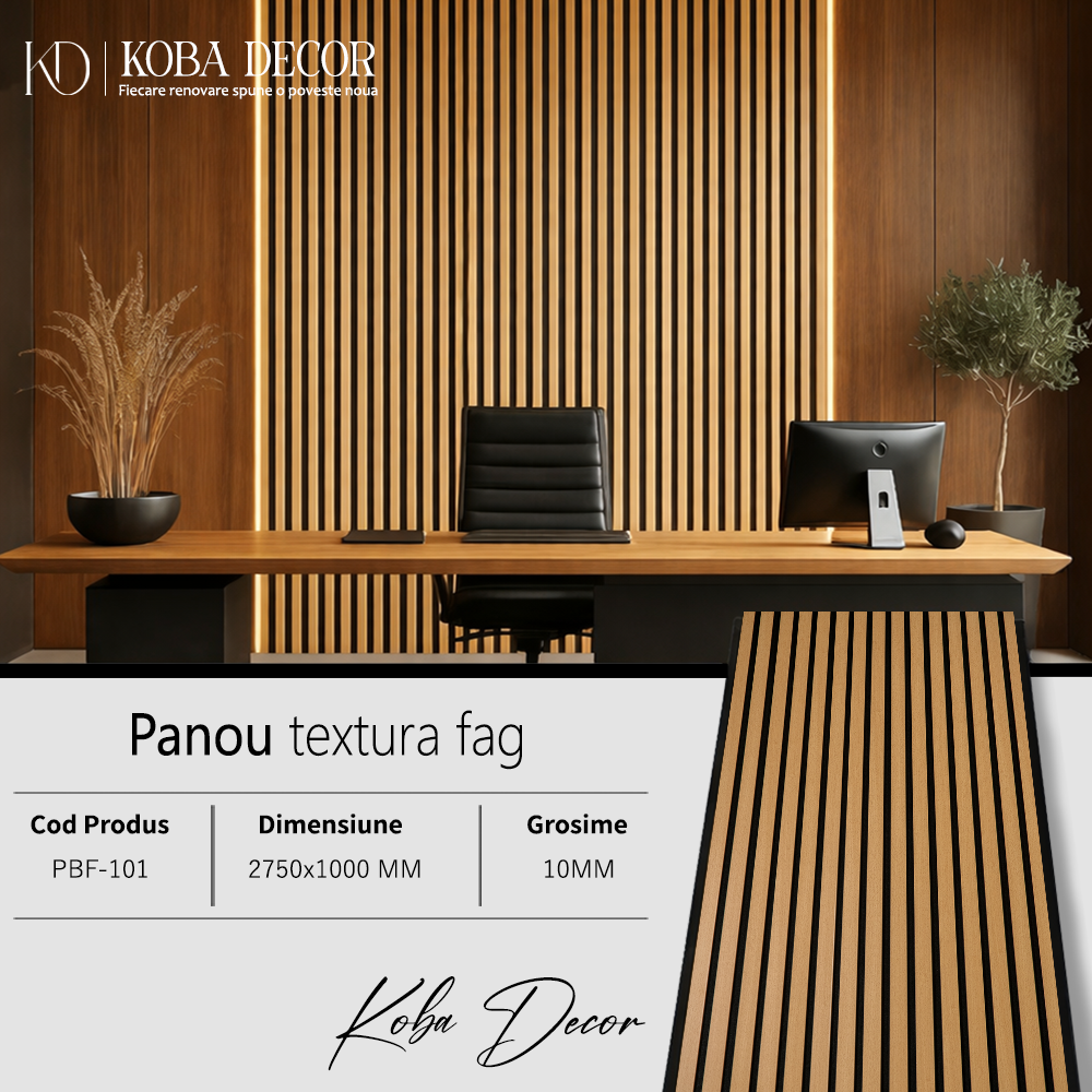 Panoul riflaj acustic decorativ fag de la KOBA DECOR este realizat din MDF si pasla, avand lamele verticale cu spatii uniforme si finisaj textura lemn de fag. Designul modern si aerisit evidentiaza peretii din living, dormitor, hol, birou sau spatii comerciale.
