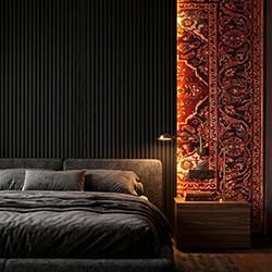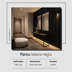 Finisajul cu panourile acustice de nuanta neagra se integreaza armonios in amenajari moderne, minimaliste sau contemporane, aducand caldura vizuala si profunzime peretilor interiori.
