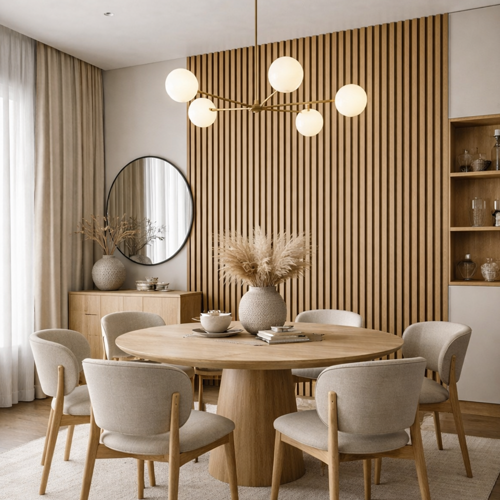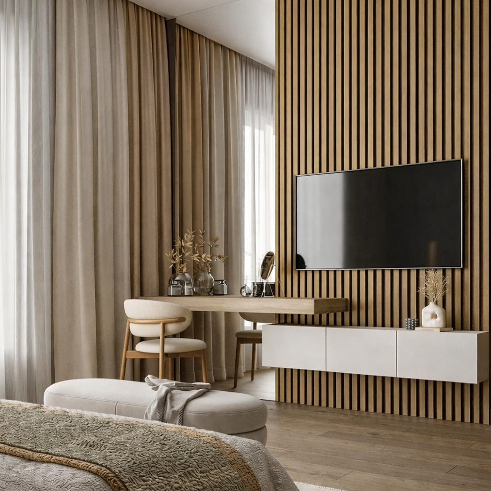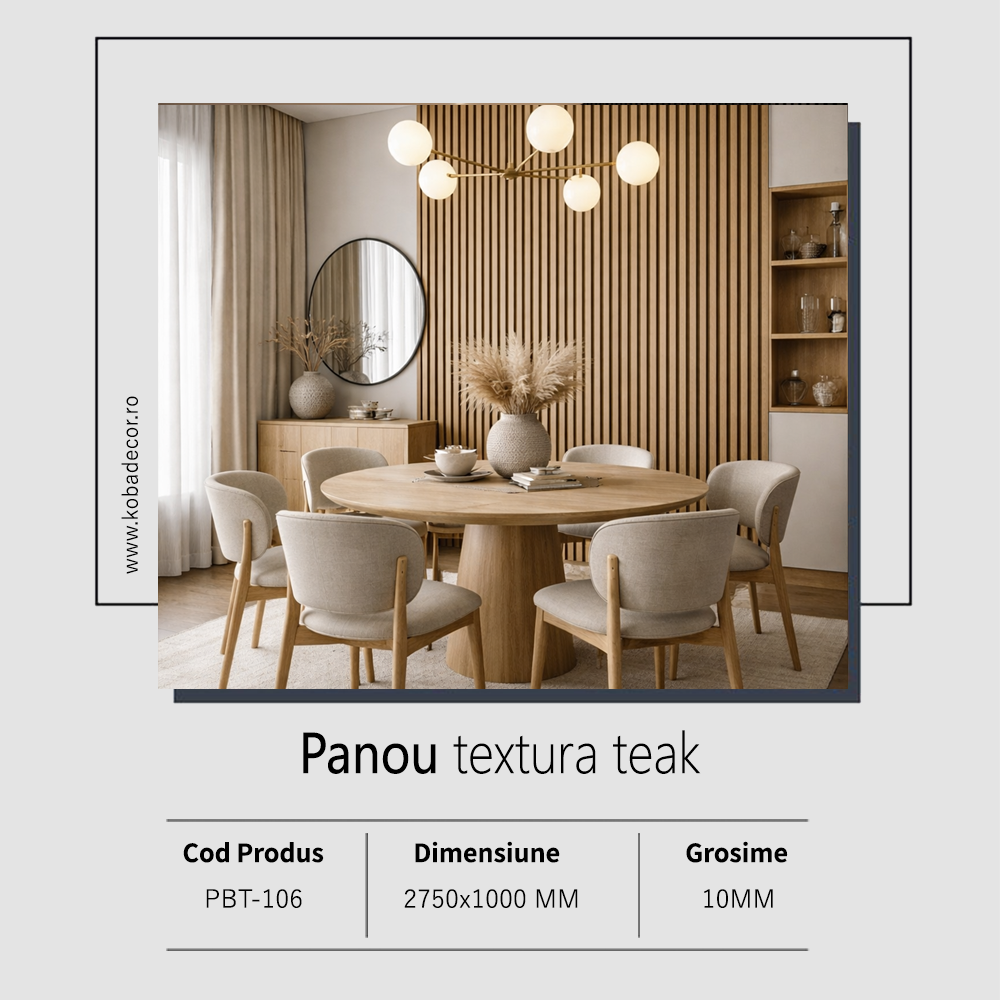 Finisajul tip teak se integreaza armonios in amenajari moderne, minimaliste sau contemporane, aducand caldura vizuala si profunzime peretilor interiori.